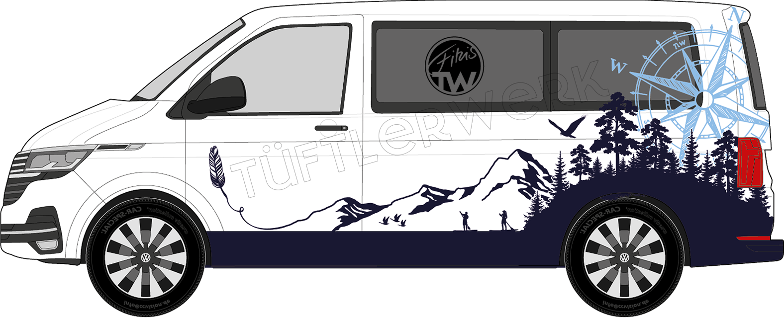 Die Feder zeichnet die Bergsilhouette auf den Camper. Der Kompass ist in die Landschaft integriert und auf dem See gehen Sie Ihrem Lieblingssport nach.